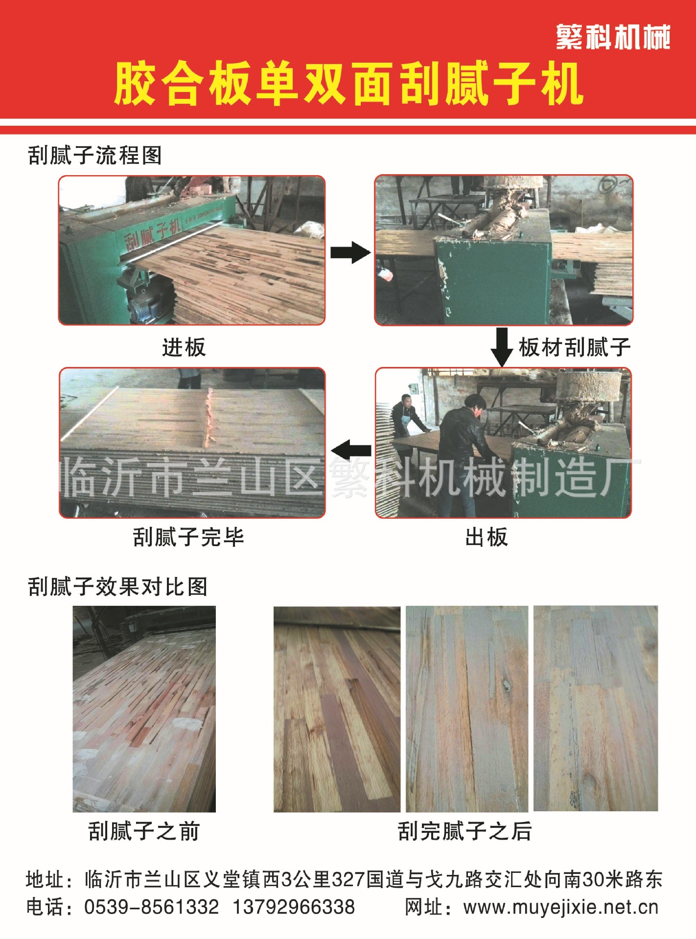 板材刮膩子機是“用膩子彌補板面表面缺陷”而發(fā)明設(shè)計的一種專用設(shè)備。主要應(yīng)用于對細(xì)木工板,多層板等板材有缺陷(坑洼,縫隙及凹陷等)的表面施加膩子進行膩平,使其板面平整。它具有操作簡單,維修方便,工作效率高,外觀精致,打出的板面平整,質(zhì)量好等特點。使用該設(shè)備進行生產(chǎn),一次性完成,生產(chǎn)效率高。減輕勞動強度,解放大批勞動力,降低產(chǎn)品成本,提高經(jīng)濟效益。并且給機床結(jié)構(gòu)合理,操作簡便,實為人造板廠家的理想選擇。